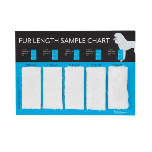 A great reference tool provides you and your customers with a visual of fur lengths for 5 standard blades #3 #4 #5 #7 and #10. Eliminates the guess work and explaining how long a blade will leave the fur your customer can see touch and feel what length their pet's hair will be.?+ Thank you for shopping at Firstpetsupplies.com.com