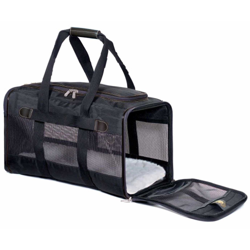 Travel in comfort and style with Sherpa(R) Original Deluxe(TM) Carrier. Perfect for traveling by plane or car, for a trip or just to the vet. Patented spring wire frame allows the rear end of the carrier to be pushed down several inches to conform to under-seat requirements. The carrier has mesh panels for ventilation, locking zippers to prevent accidental escapes, and includes a Seat Belt security strap which doubles as a luggage strap. Top and side entry options make it much easier to comfortably load pets in the carrier. A large side zippered pocket can hold your important pet travel documents and anything else your pet may need. The no-slip shoulder strap is adjustable and features a padded support for comfort. A soft, cozy, removable, and machine-washable faux lambskin liner is included. Sherpa(R) replacement liners are also available and sold separately. Approved for use on most major airlines. Small and medium sizes are included in Sherpa(R)'s Guaranteed On-Board(R) program. Available in sizes medium and large.