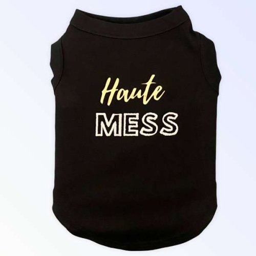 We are all a little bit of a "Haute Mess". This is the perfect casual tee or dress for everyday wear!Featuring a metallic gold and Puff print. Thank you for shopping at Firstpetsupplies.com.com