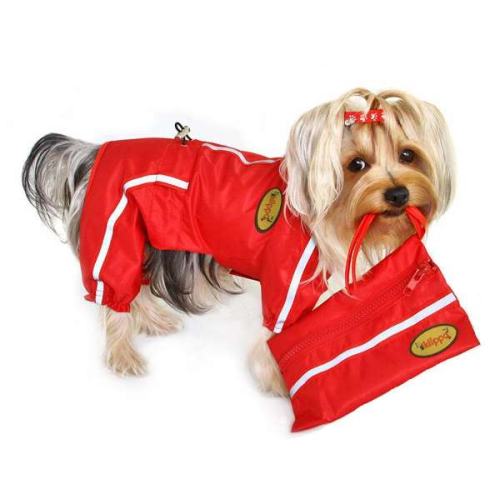 Sporty raincoat/bodysuit with safety reflective stripes, comes with a matching zippered pouch for easy storage. A large D-ring on the back for easy leash attachment, and an adjustable elastic band for a snugly fitting. Velcro closure. A small D-Ring attached above the top snap button closure to add on a "Klippo" charm or ID tag! Each outfit comes with a "Klippo" metal charm. (Size L fits: Neck 11"~13"; Chest 16"~18"; Back Length 12"~14") Thank you for shopping at Firstpetsupplies.com.com