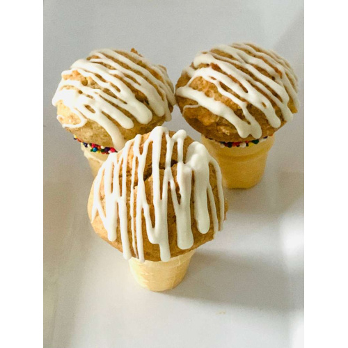 Blueberry cake ball with vanilla chips inside, sitting on top of a small, crunchy vanilla ice cream cone that has been dipped in peanut butter and rolled in sprinkles, then drizzled with vanilla icing.