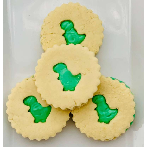Cute Oreo cookies with a dinosaur cut out on the top, filled with green vanilla icing.