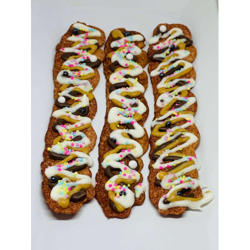 Crispy turkey bacon drizzled with carob, peanut butter and vanilla icing, then sprinkled with festive colored toppings. Sprinkles color subject to change per season/holidays.