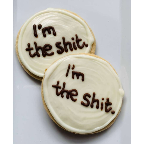 Sassy round vanilla cookie, dipped in white vanilla icing and showing some puppy attitude in carob icing.