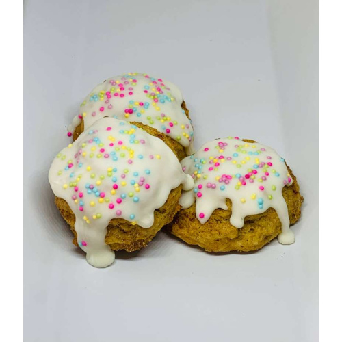 Crunchy cake ball made with honey and cinnamon, dipped in vanilla icing vanilla and decorated with festive sprinkles. Sprinkles color subject to change per season/holidays.