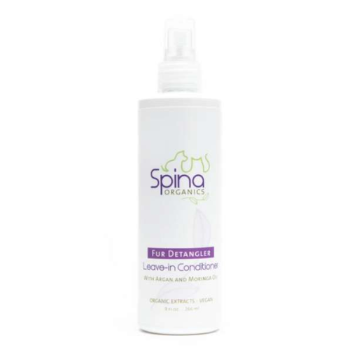 This lightweight Leave-In Conditioner Detangler leaves your dog's fur soft and nourished without weighing it down. Enriched with Argan and Moringa oils, our Leave-In Conditioner eliminates tangles and leaves fur static-free. After a Spina Organics Dog Body wash and towel-drying, lightly spray the Conditioner Detangler over your pet's coat and work it into the skin and fur with your fingers. Then, gently brush and dry the coat for amazing shine and softness. Benefits Rich in Omega 3, 6, and 9 oils that moisturize skin and fur.