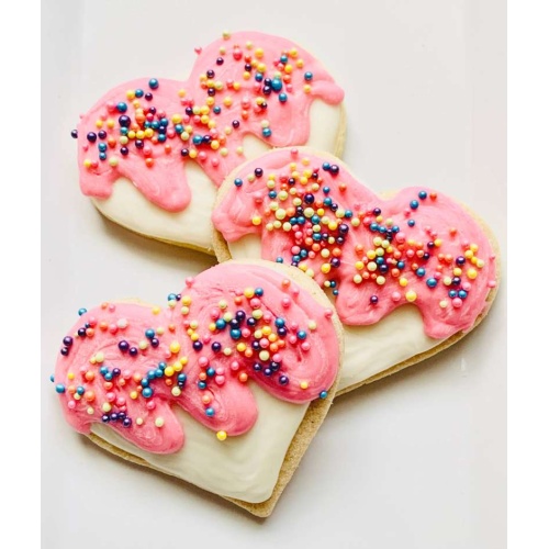 Vanilla heart shaped cookie, iced in white and pink vanilla, dusted with colorful sprinkles.