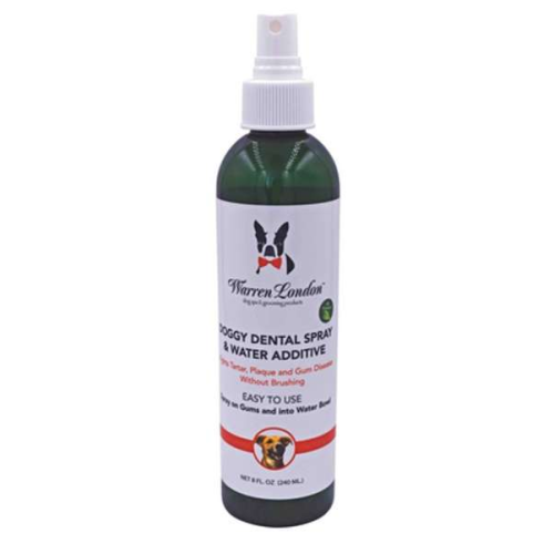 Warren London Doggy Dental Spray and Water Additive helps to fight Plaque, Tartar, Bad Breath and Gum Disease without brushing! This product is so easy to use and helps to keep your pups mouth looking and feeling fresh. Contains naturally simple ingredients: Water, Peppermint, Cinnamon, Natural Honey, Cloves, and Aloe Vera. Easy to Use: Simply add 4-6 sprays daily into your dog's water bowl, or add 2-3 sprays along gums & teeth on both sides. Thank you for shopping at Firstpetsupplies.com.com